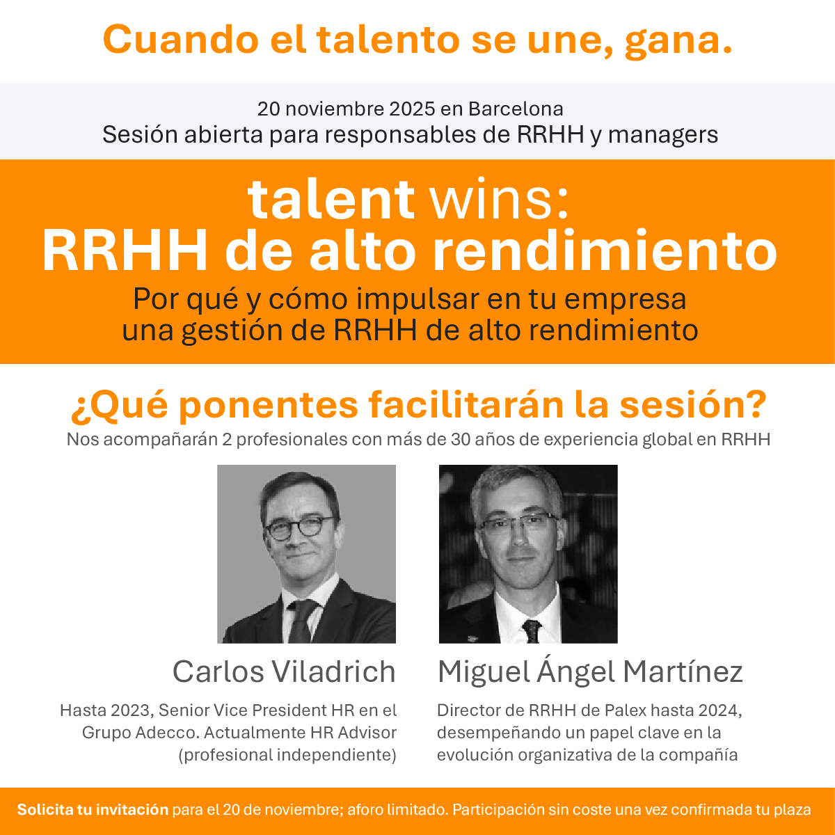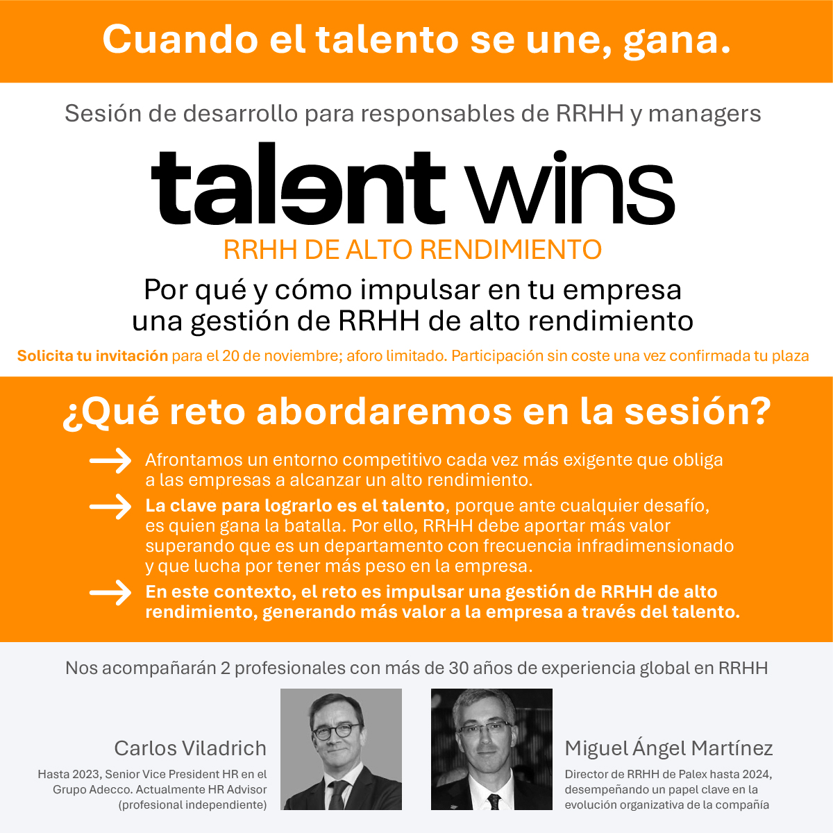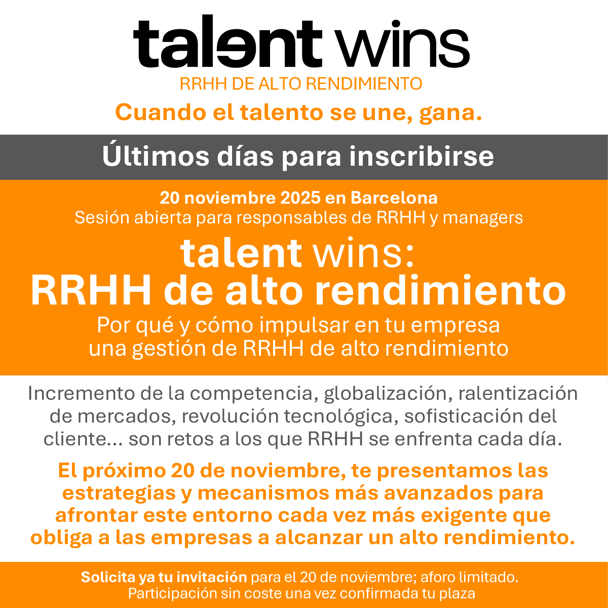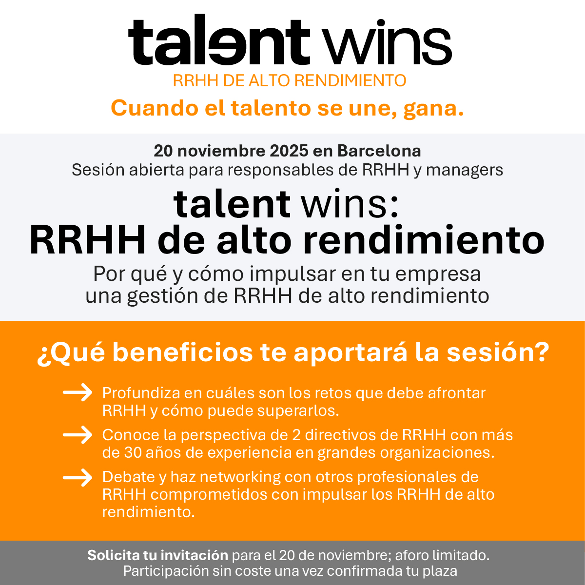 Solicita tu invitación gratuita para la próxima sesión de desarrollo para responsables de RRHH y managers «𝘁𝗮𝗹𝗲𝗻𝘁 wins: RRHH de alto rendimiento» del próximo día 20 de noviembre en Barcelona.